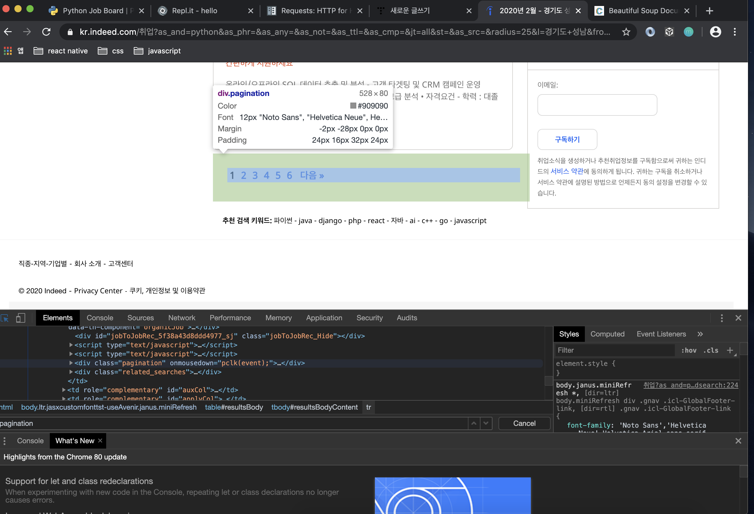 * 우리는 페이지 나온 부분을 추출해야 하는데 <div class="pagination"> 이라는 것을 알 수 있다.