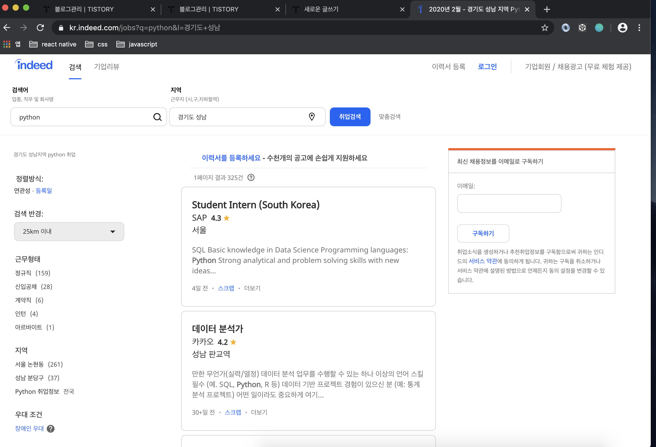 만약 indeed에서 python을 검색하게 되면 외부 사이트에서 모집하는 python 관련 링크가 검색될 것이다.