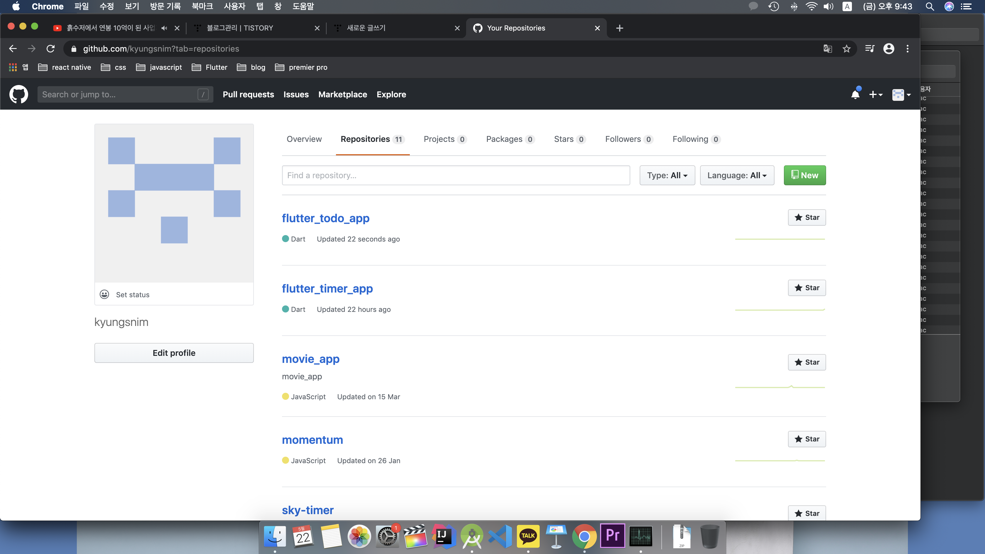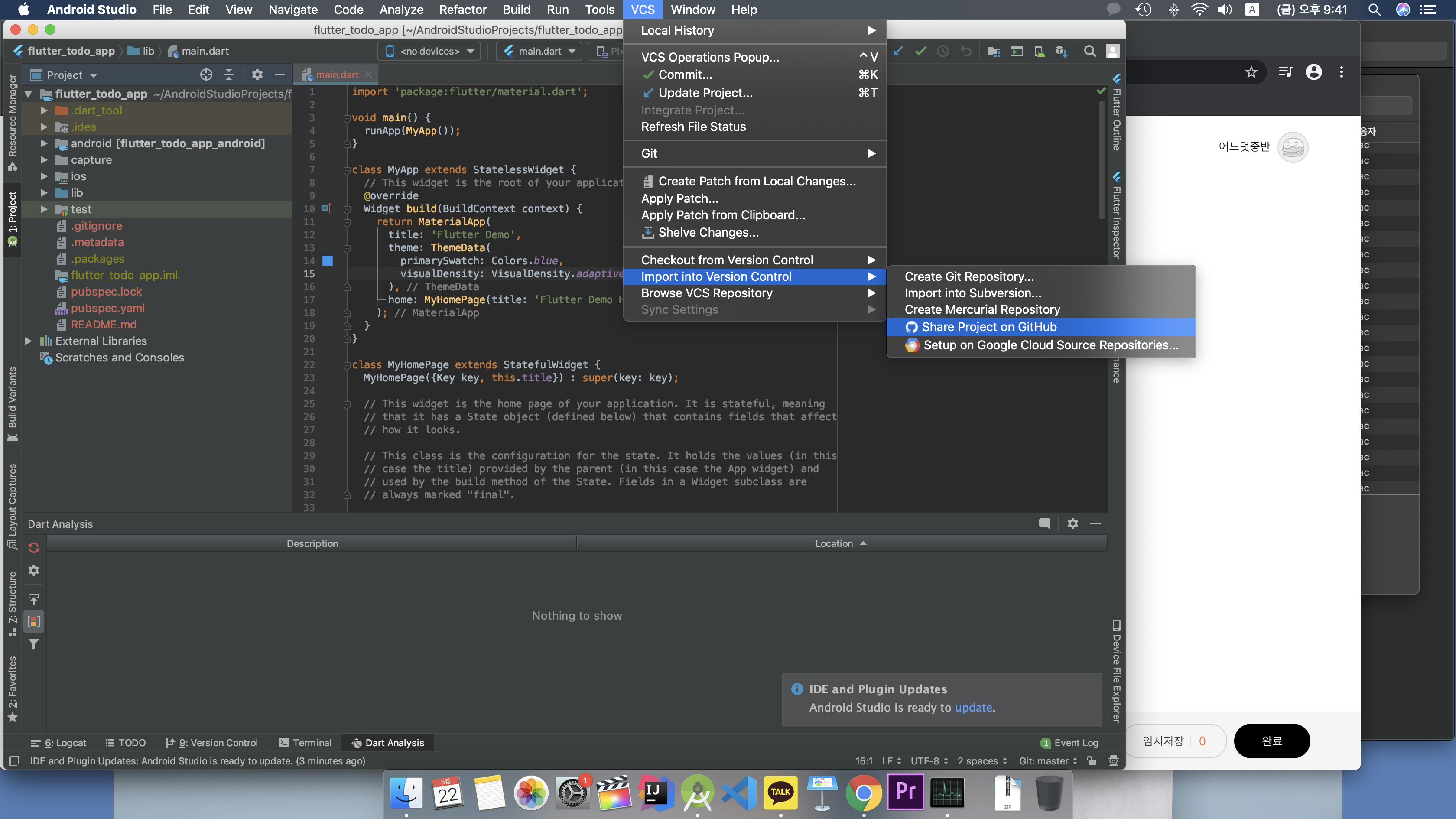 - flutter app 생성 > 프로젝트 열기 > VCS > Import into Version Control > Create Git Repository